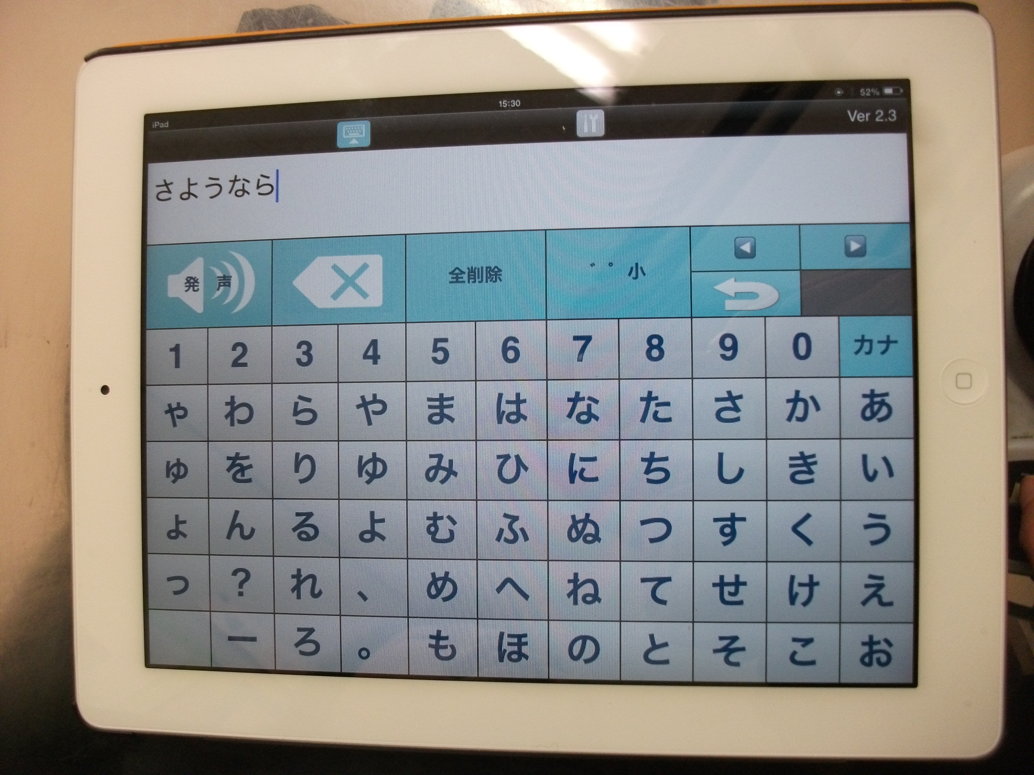 ・自分の伝えたい言葉を入力し、発声ボタンを押すと、それを音声で読んでくれます。・入力用の平仮名のキーを押すと単音で音声が出ます。また、つづった単語や文章全体をまとめて読みあげさせることもできます。
