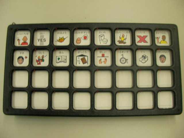 ボタンが32個のVOCA。ランプが順々に点灯していくので、意図したところでボタンを押すことでメッセージを再生できる。