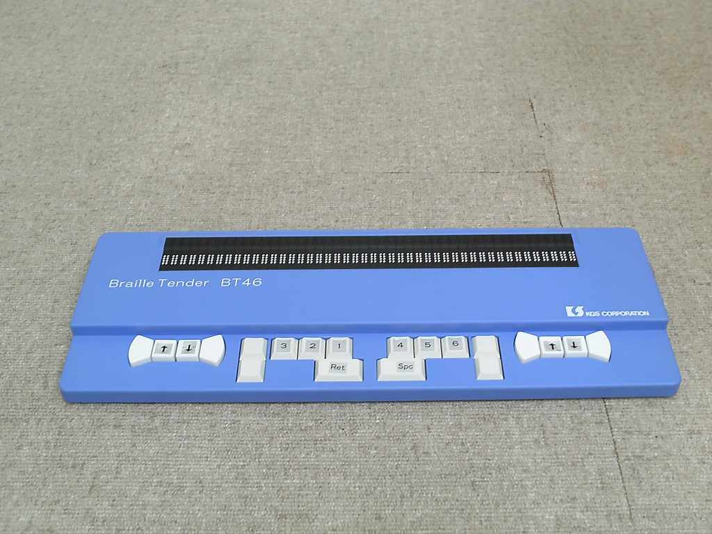 点字表示部46マス表示の点字ディスプレイ。薄型設計で、キーボードやノートパソコン との使用を考えたデザイン。点字表示部が本体の一番奥に配置され、手の移動 が少なく点字を読むことができる。