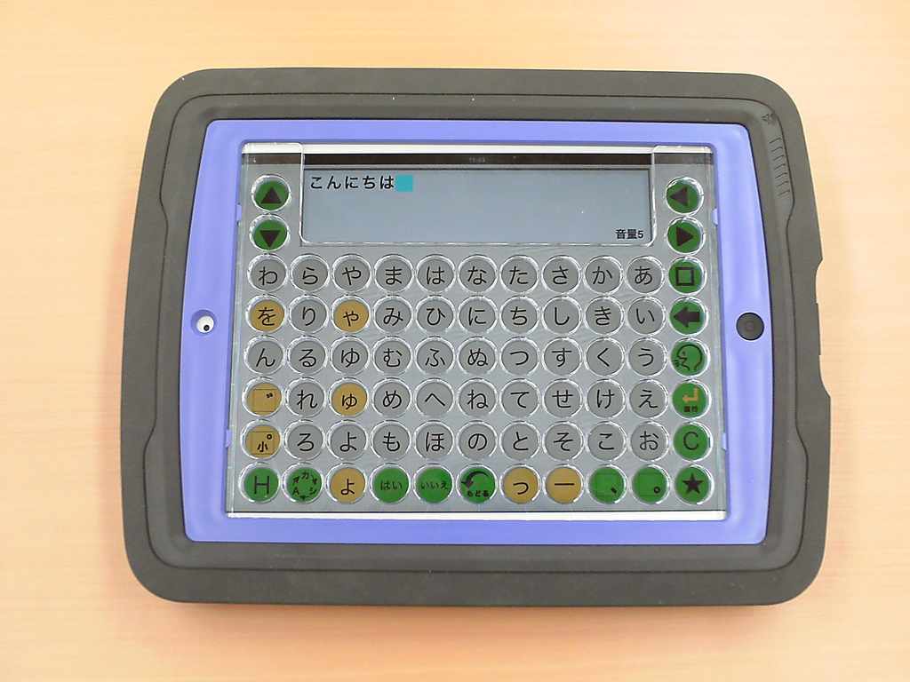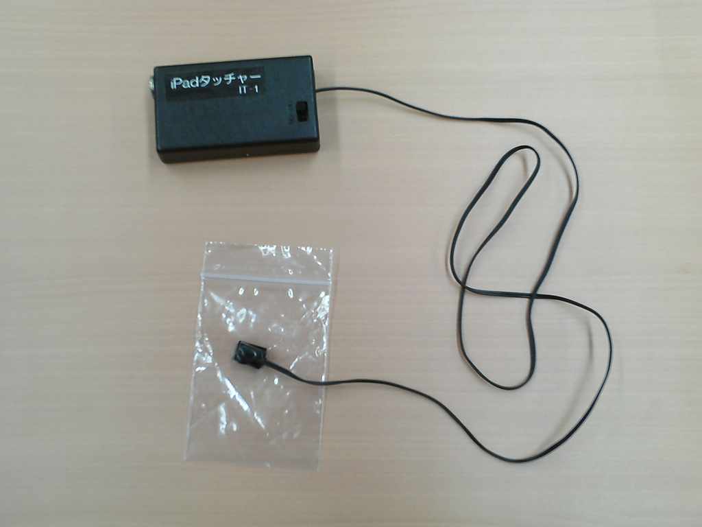 指のかわりに外部スイッチでiPadをタッチするためのユニット。3.5mmのジャックが付いた電源部とタッチを行う静電スイッチ部の二つで構成されており、電源部に手持ちのスイッチを接続して使用する。静電ユニットを置いたところのみタッチ可能なので、別の所をタッチしたい時は静電ユニットを張り替えて位置を変える必要がある。