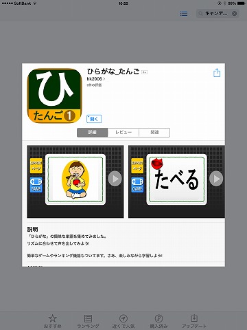 ・ひらがなの学習アプリです。ゲーム感覚で身近な単語の読み書き学習を進めることができます。・なぞり書きモード(画面上の文字を、表示される書き順に従いなぞる)、かるたモード(音声で読み上げられたカードを探す)、単語と文字カードの対応モード(例:イラストと一緒に提示されたいぬの文字を見て、ランダムに並んだひらがなから「い」「ぬ」を順番に押す)、単語フラッシュカードモード(物や動作を表す絵を見て、物の名前や動作を表す語を3秒以内に答える)の4つのモードがあり、いろいろな学習に取り組むことができます。・どのモードにも「かんたん」「ふつう」「むずかしい」のランキング機能がついています。